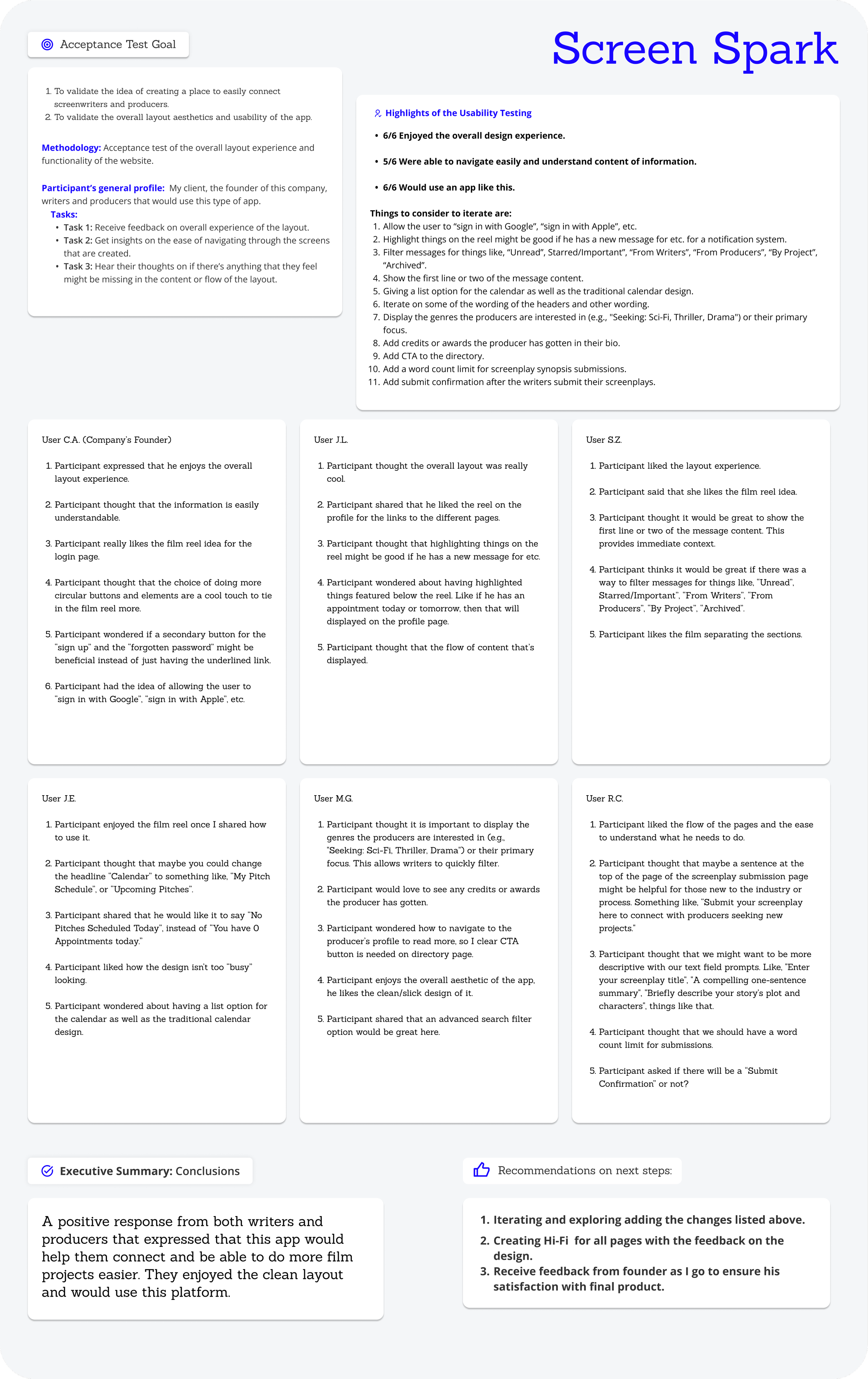 I conducted user interviews as part of the initial research phase. The process involved asking questions that focused on the specific difficulties faced by screenwriters and movie producers in their creative process, as well as what features they would find most valuable in a new application. By actively listening and synthesizing this feedback, I was able to translate their real-world problems into the foundational elements of the digital solutions I designed.